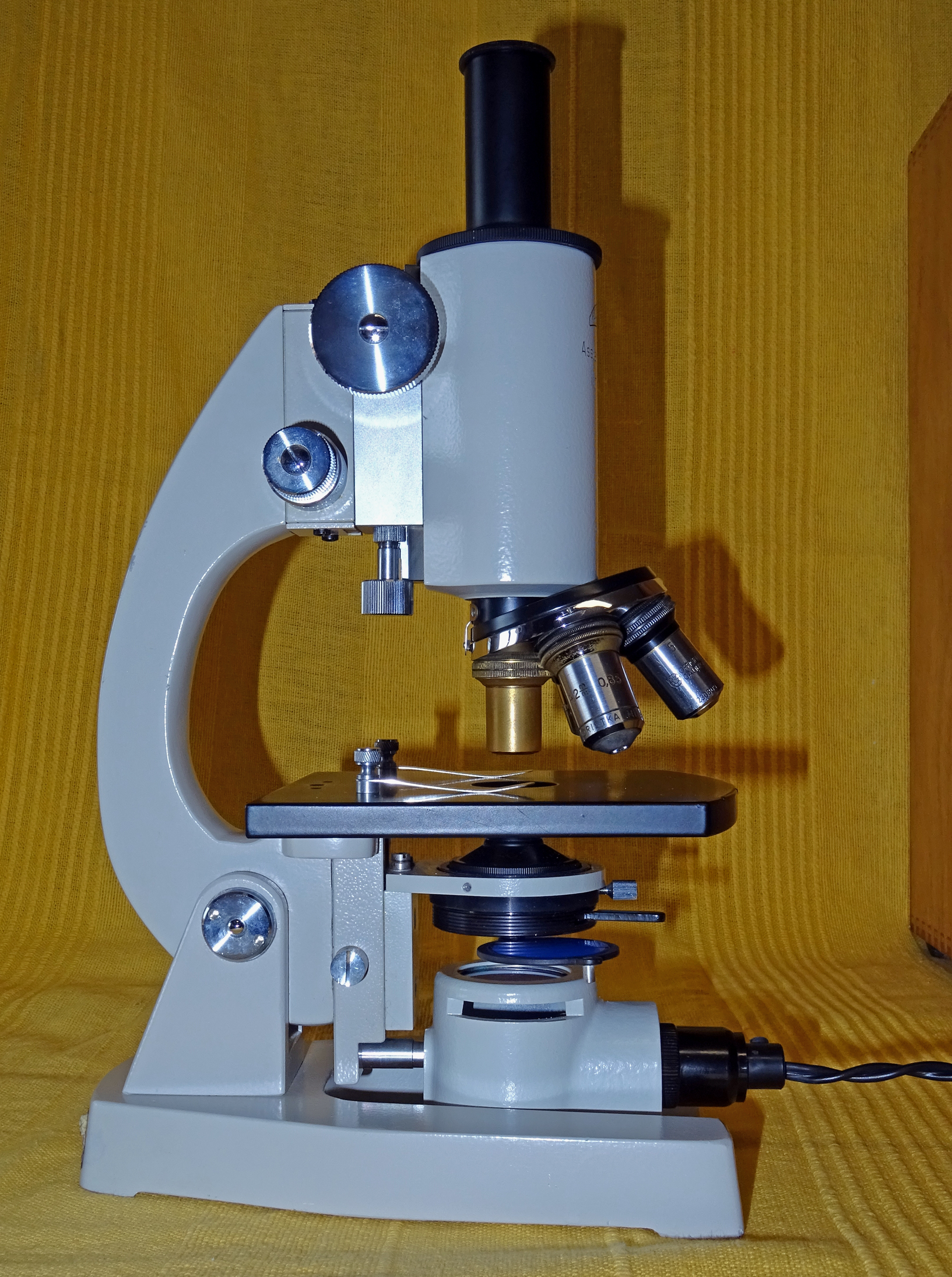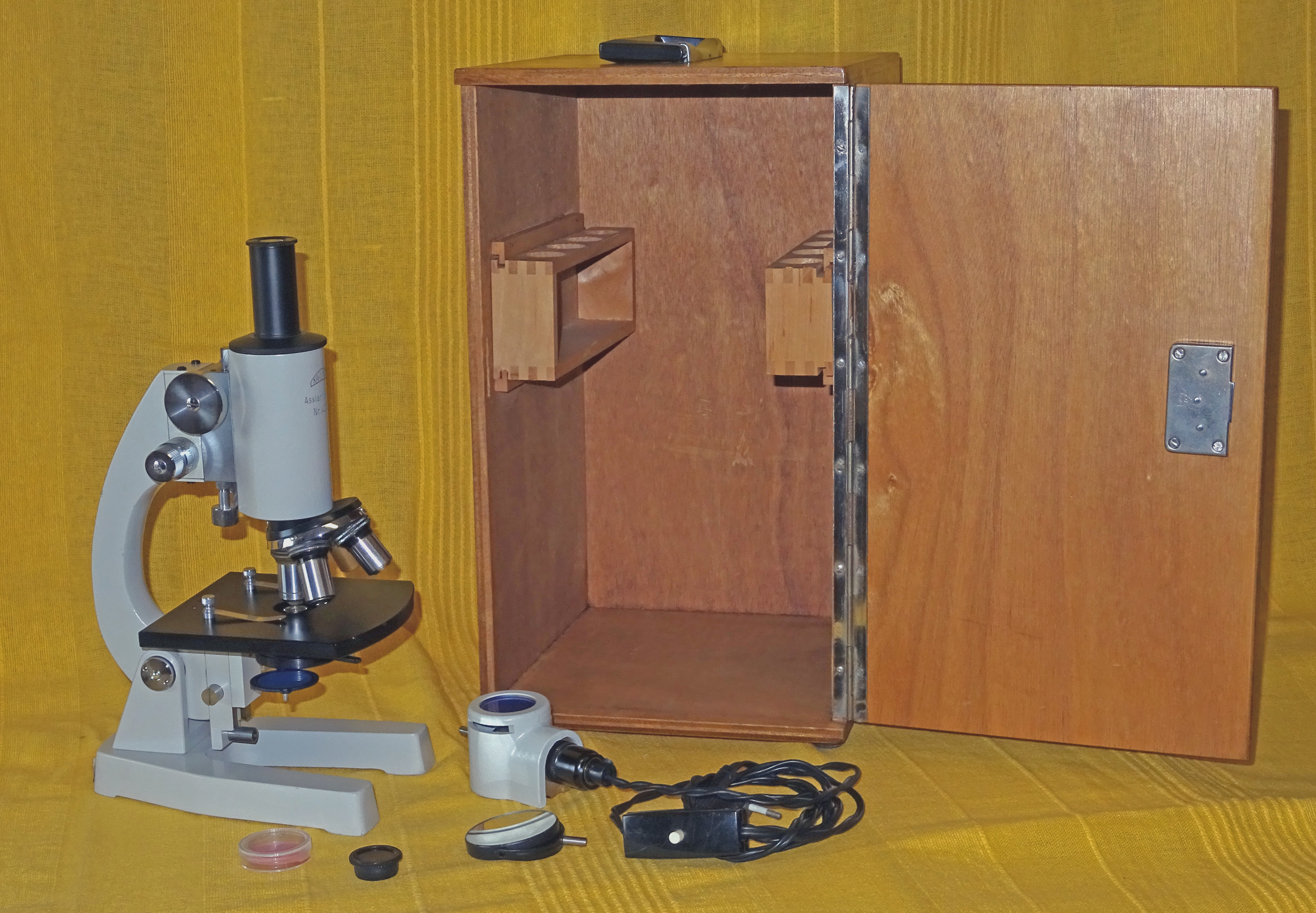 Both the wooden case and the microscope looked in very good order.