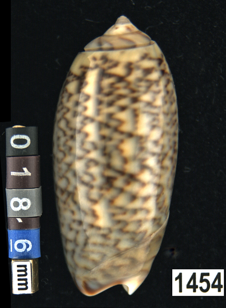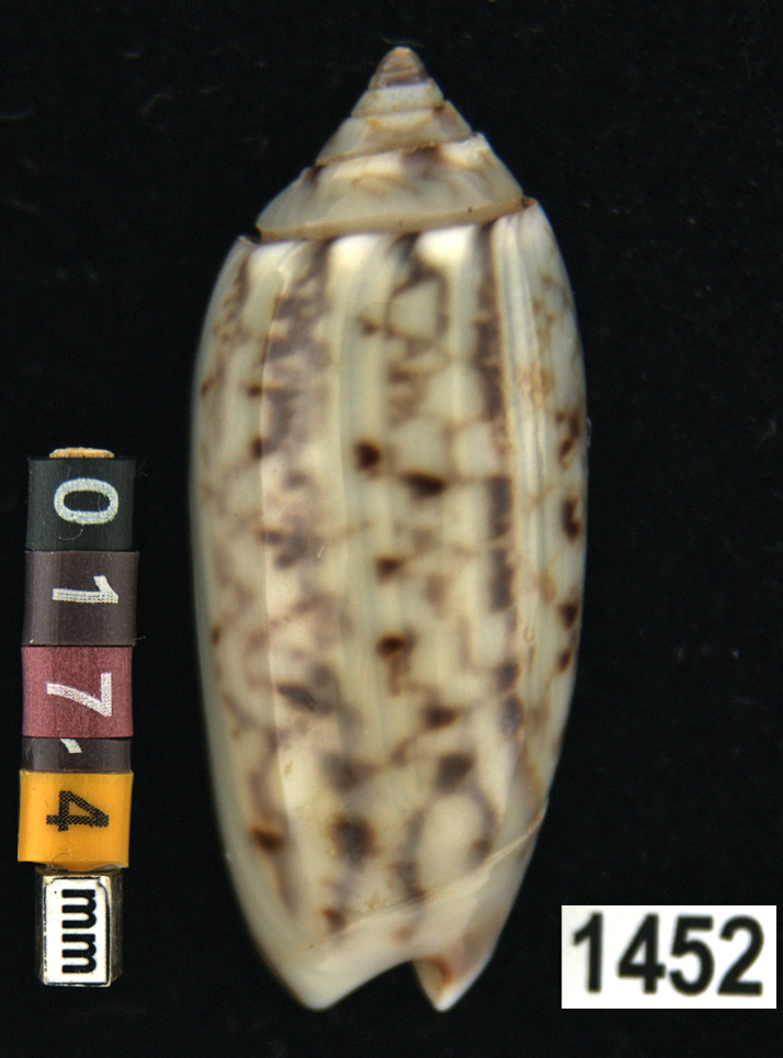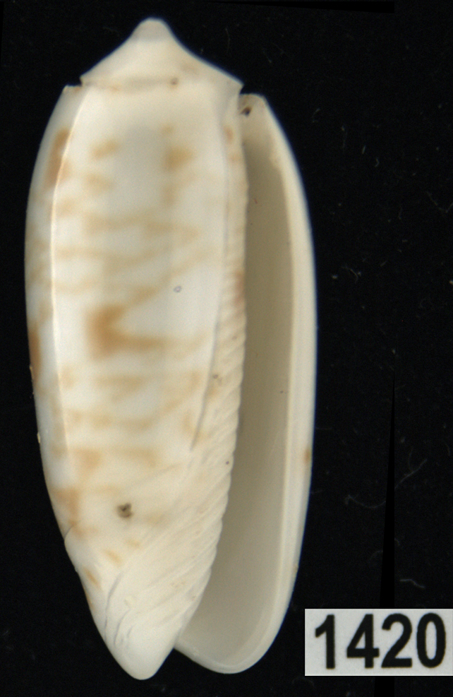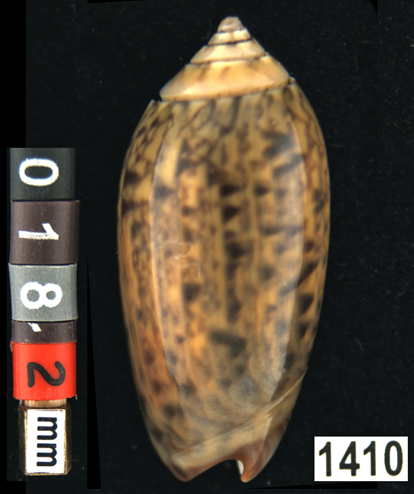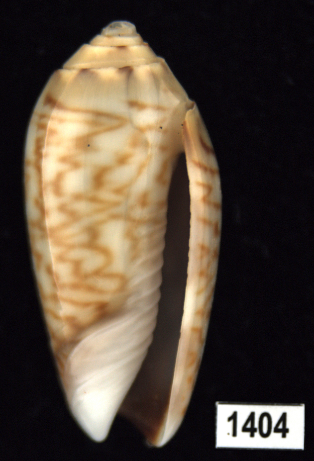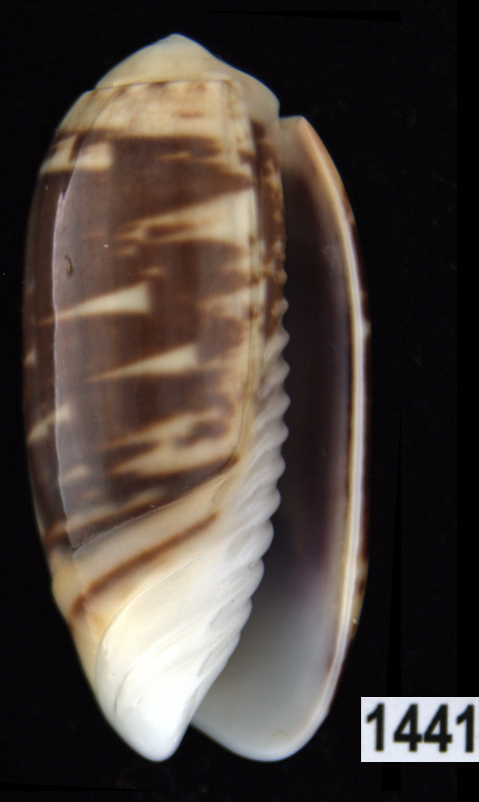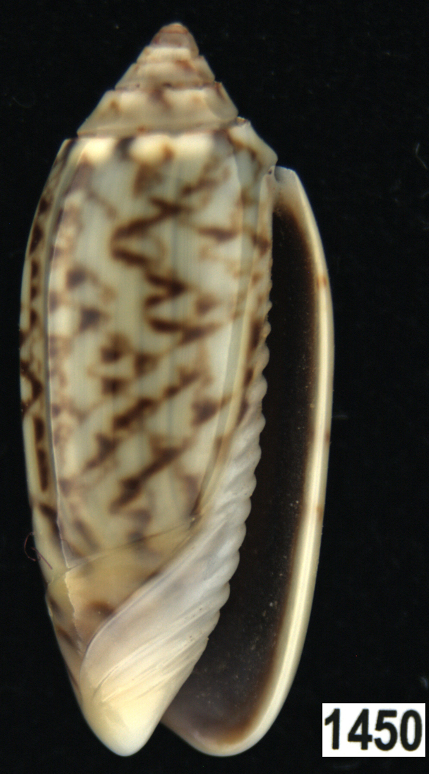 |  Oliva (Americoliva) venulata f. cumingii Reeve, 1850 La Paz, Baja California, Mexico |